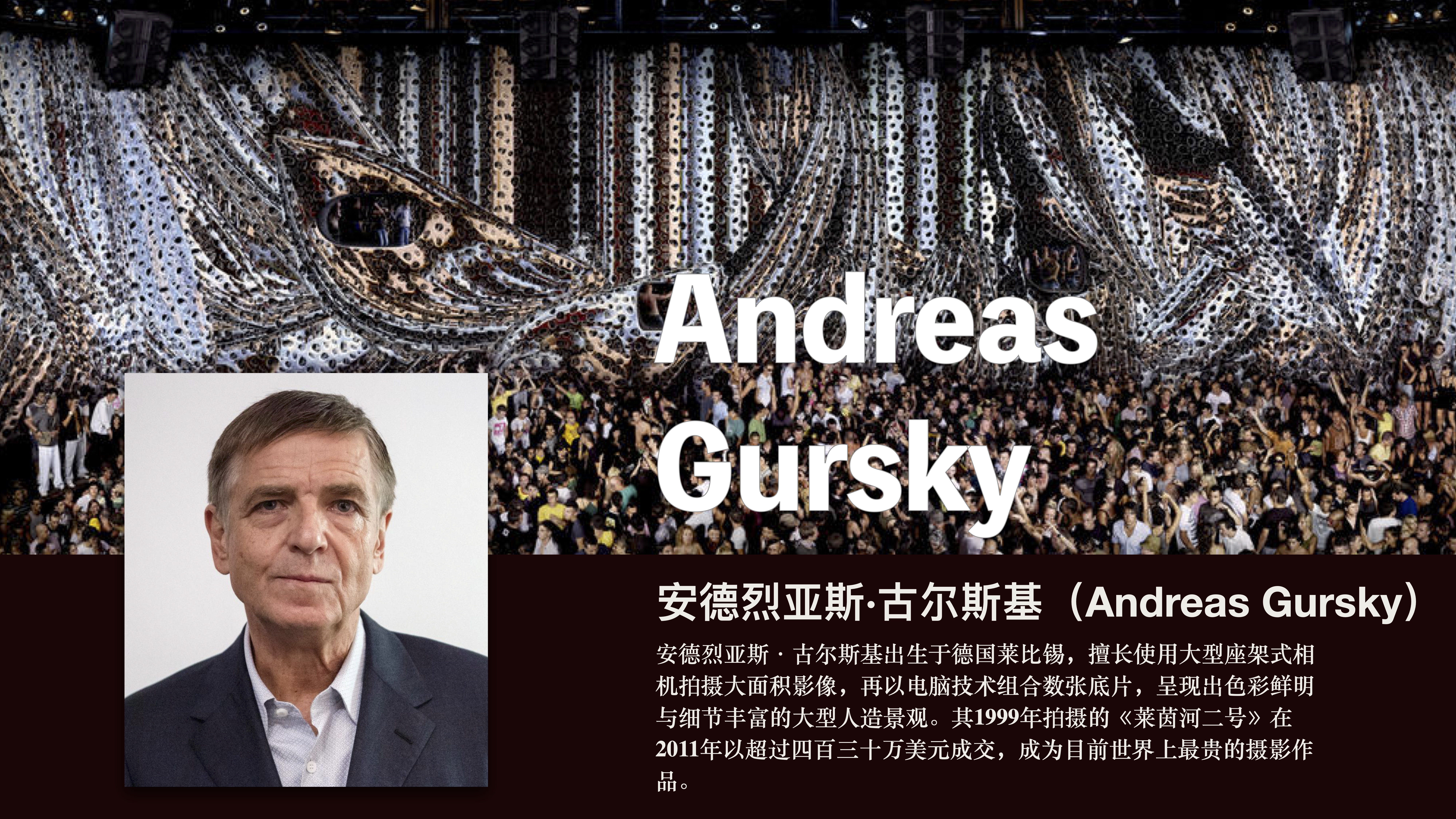 安德烈亚斯.古尔斯基(Andreas Gursky)1955年出生于德国莱比锡,在杜赛尔多夫长大,他的父亲是杜赛尔多夫的一个成功的商业摄影师。