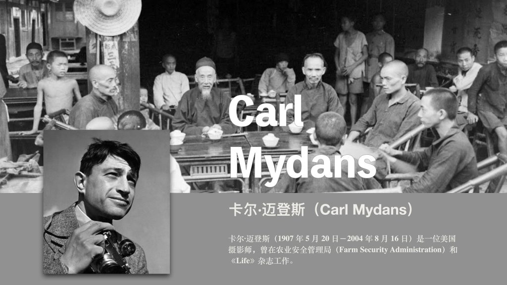 提起《生活》杂志的元老级摄影师Carl Mydans(卡尔·迈登斯),我们脑海里就会浮现这些闻名遐迩的照片:1940年意大利法西斯党徒的群魔乱舞、1941年的重庆大轰炸、1944年法国光复之后民众羞辱通敌妇女、1945年卷土重来的麦克阿瑟将军登陆菲律宾海滩、1945年9月2日密苏里号战列舰上的日本投降仪式、1948年的日本福井大地震、1963年11月22日纽约地铁里人人在读肯尼迪遇刺新闻的报纸,以及诗人埃兹拉·庞德、小说家威廉·福克纳等名人封面肖像。